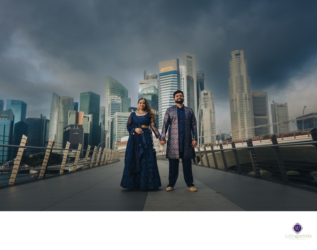 A wide-angle candid shot of Rahul and Sam embracing with the modern Singapore city skyline and Marina Bay Sands in the background during a golden hour pre-wedding session.
